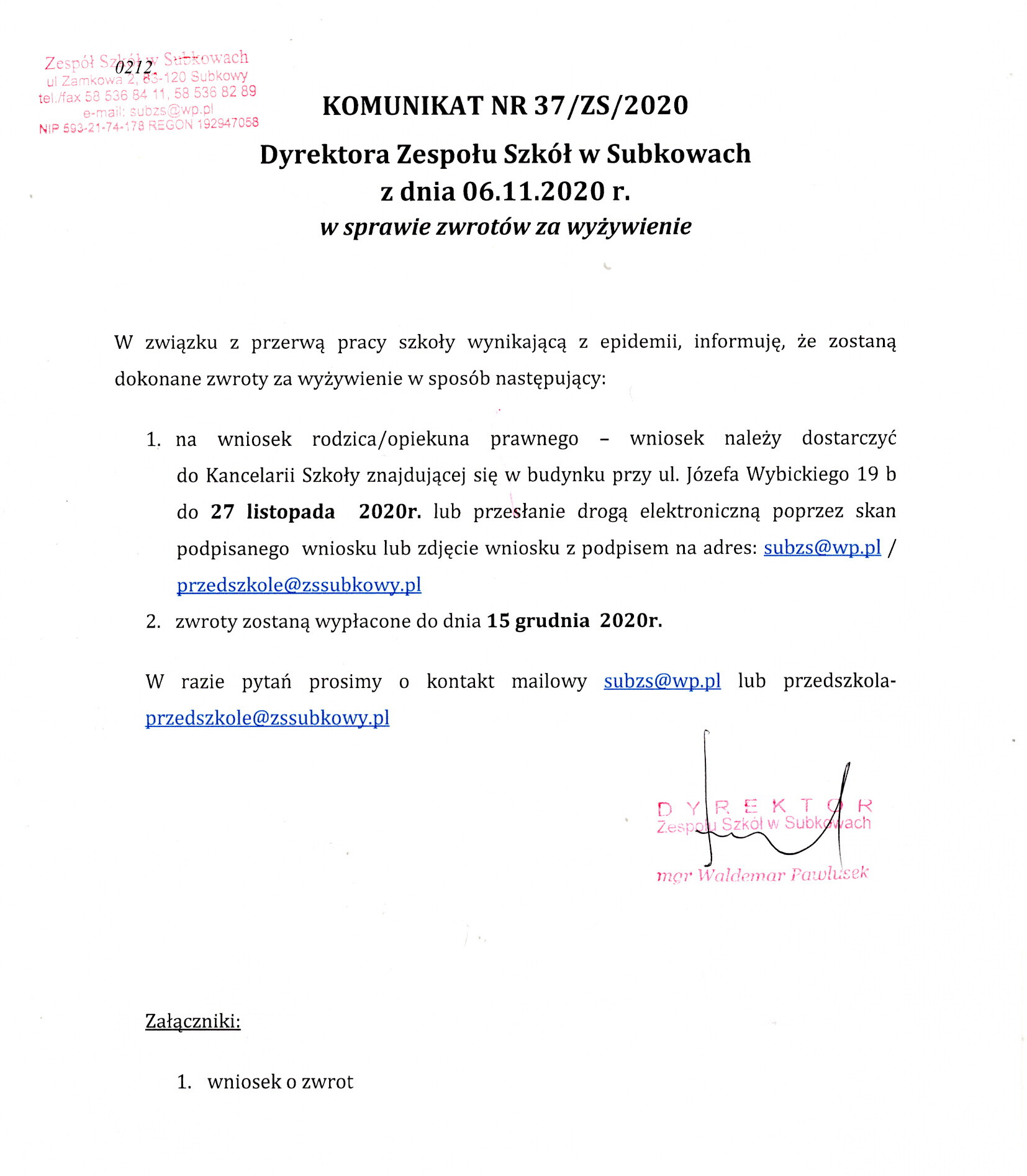 Informujemy, iż w związku z przerwą pracy szkoły, wynikającą z aktualnej sytuacji epidemiologicznej, zgodnie z wystosowanym Komunikatem Dyrektora Zespołu Szkół w Subkowach, dokonane zostaną zwroty opłat za obiady za miesiące: październik i listopad 2020r.