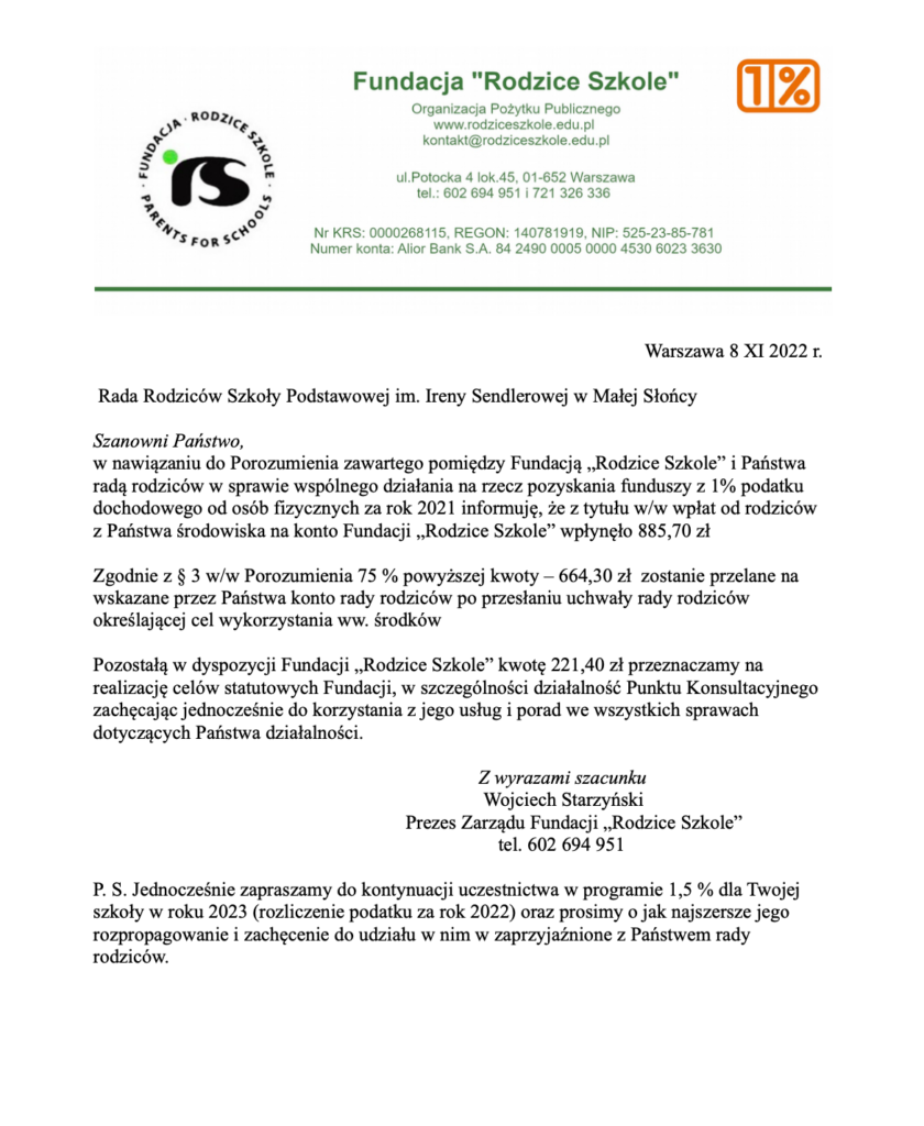 Miło nam poinformować, że w wyniku Porozumienia zawartego pomiędzy Fundacją „Rodzice Szkole” i Radą Rodziców naszej szkoły, udało nam się pozyskać środki w kwocie 664,30 zł.
